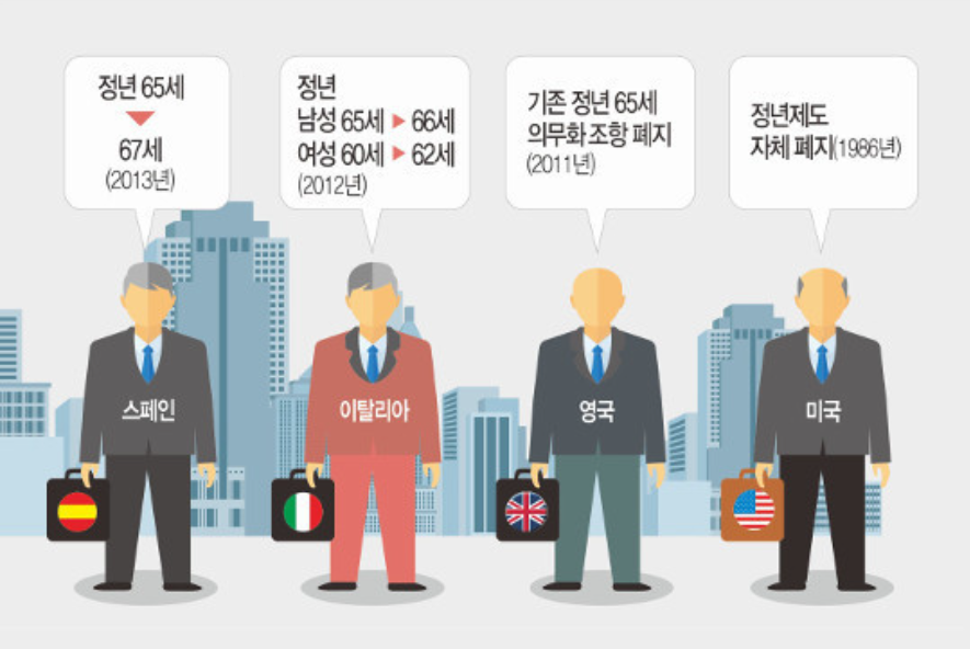 OECD 국가 중 정년이 60세로 설정된 국가는 한국이 유일하며, 다수의 선진국들은 65세 이상으로 정년을 연장하거나 폐지하는 방향으로 정책을 추진하고 있다.