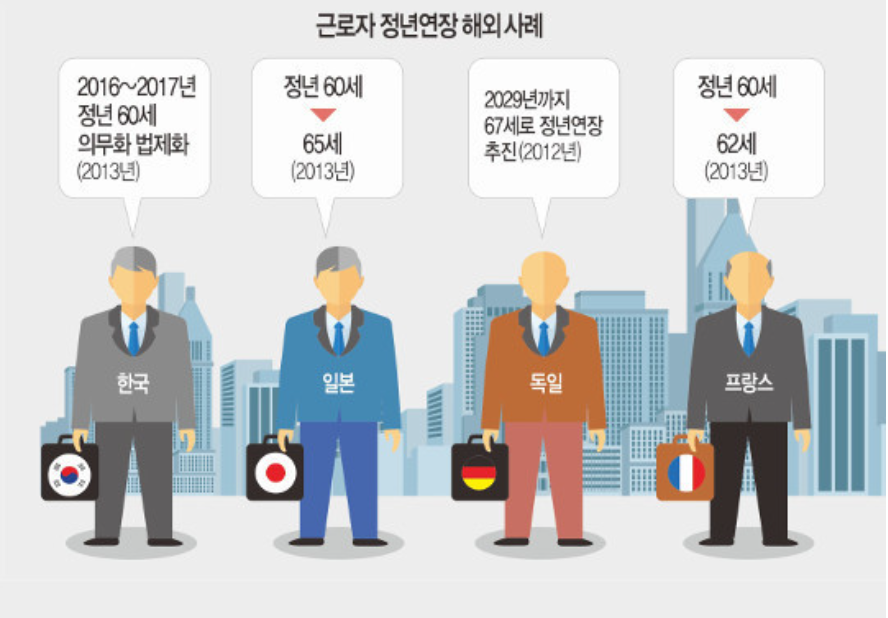 일본은 2021년부터 정년을 65세로 연장했으며, 기업들에게 70세까지 고용 연장을 유도하는 정책을 시행하고 있다.